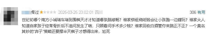 更有人直接吐槽起了剧情,剧中崔业之所以会“逆天改命”,就是因为去了银行取钱,而之所以去取钱,就是因为儿子的腿摔骨折了,之所以儿子的腿会骨折,就是因为崔业和母亲在烧纸的时候,儿子在一旁乱跑,那么搁日常生活中,谁家烧纸祭祖的时候,小孩会在一旁乱跑啊?